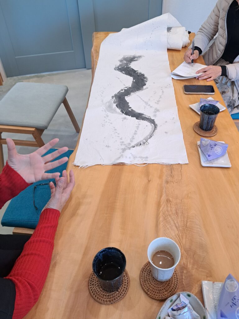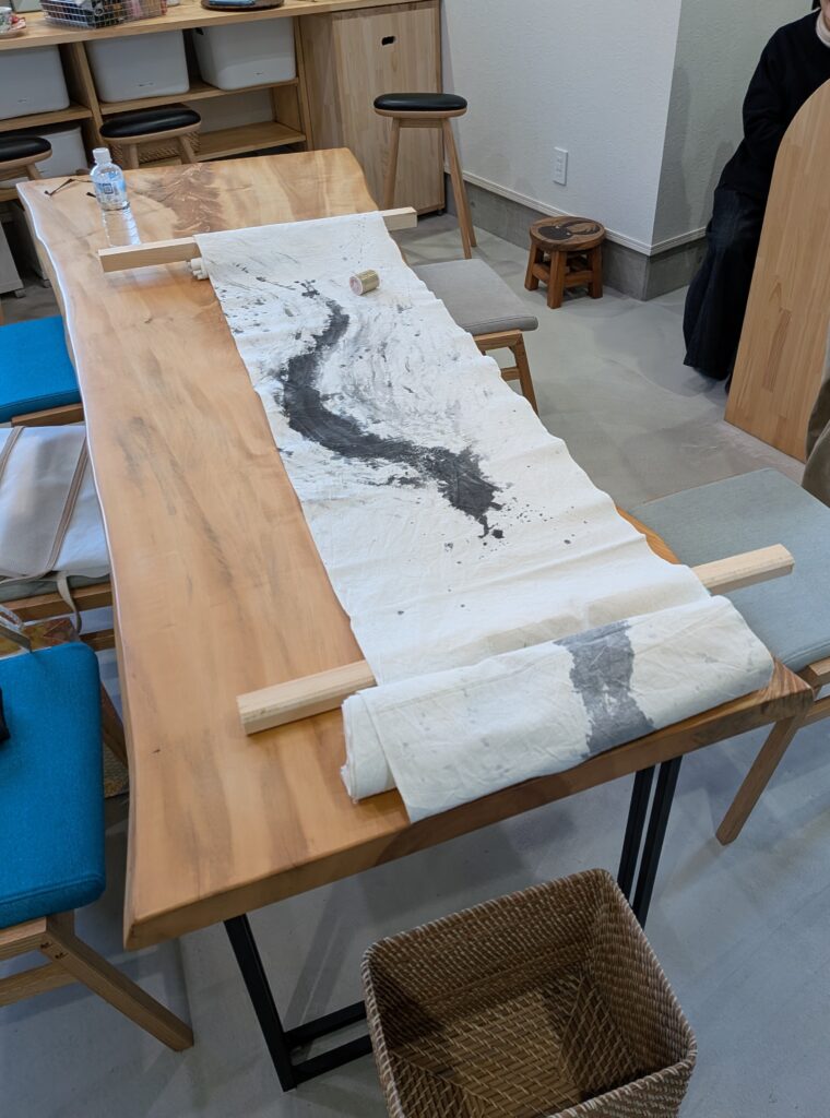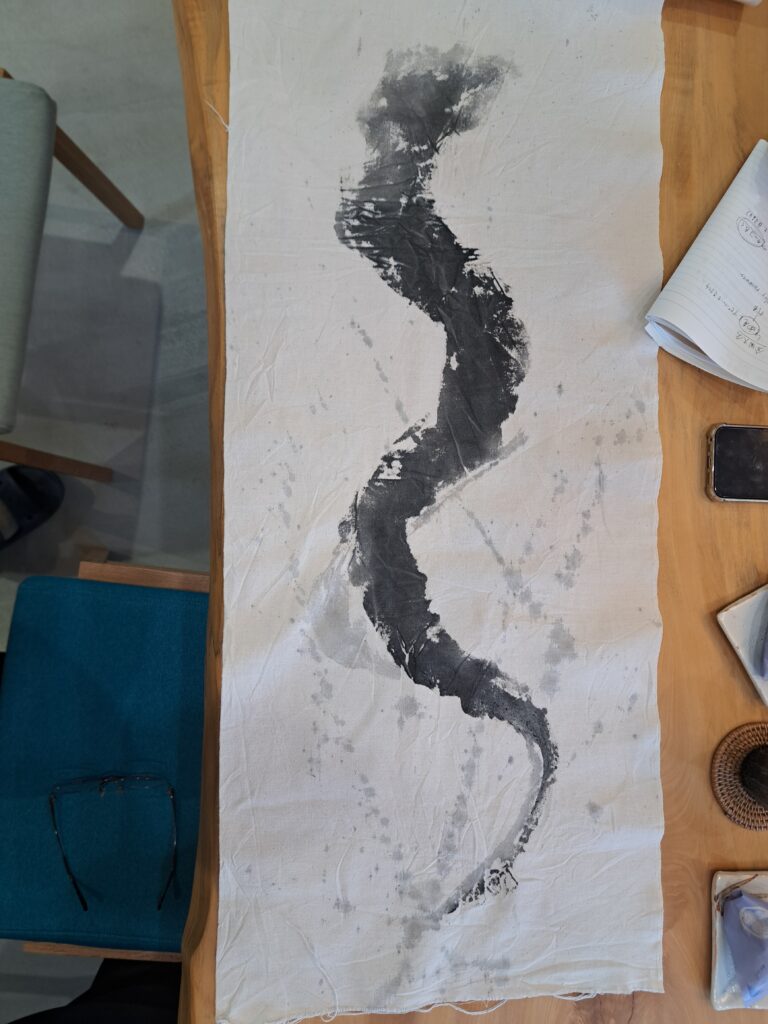 打合せ時に、試しに描いた作品を持ってきてくださり、イメージが定まりました。その後は僕が「うなぎ登り」をチーム名にした時の思い、どのようなイメージの作品を期待しているかなど打合せをさせて頂きました。布に墨で書くって、味があってカッコいいなと思いました。