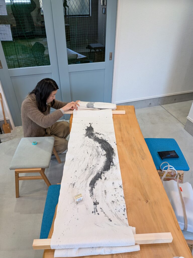 その方のインスタを見ていると、公園の地面に用紙を置いて作品を描かれている写真があったので、打合せの際に理由を聞いてみたのですが、紙や布からはみ出して書きたい衝動にかられた時にそうしたいからとのことでした。